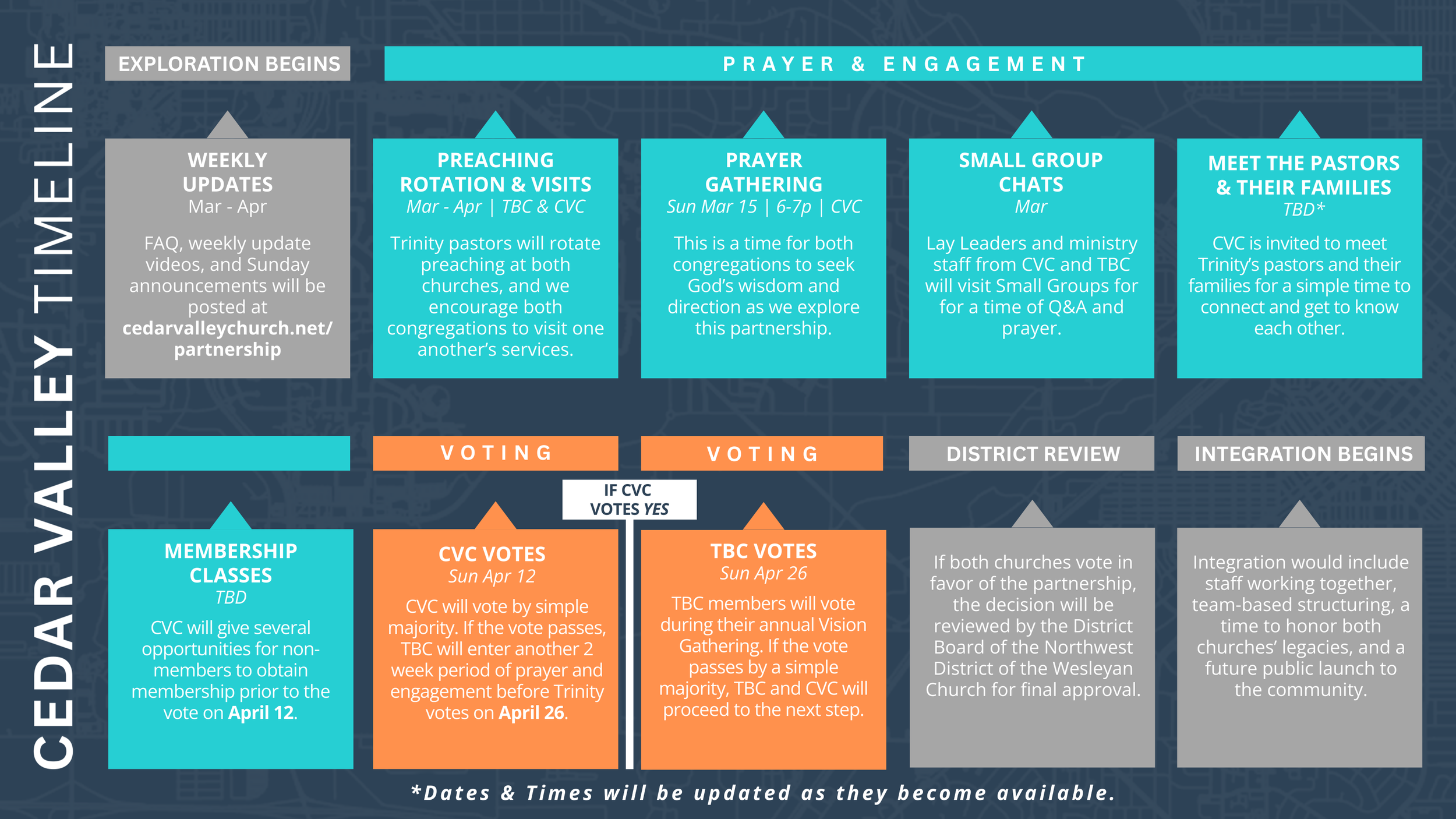 We believe God may be inviting us to explore what could happen if these strengths came together for one unified mission. Over the coming weeks, we will have opportunities to share more details, pray together, and discern as a church family where God is leading us. This will include weekly updates, prayer gatherings, Small Group meetings, and opportunities to visit Trinity Bible Church. Please check this webpage regularly during the exploration period, as we will continue to add new information as it becomes available. If you have any questions, please let us know! You can submit questions to info@cedarvalleychurch.net.